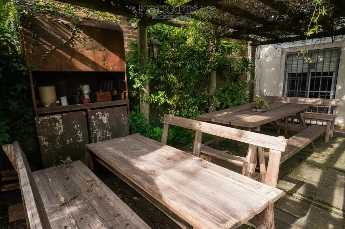 Jardín arbolado con un gran Timbó y parrillero.